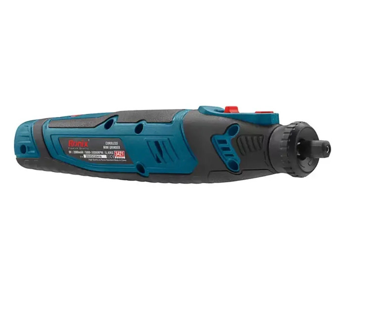فرز مینیاتوری شارژی 3421 رونیکس مجهز به یک موتور DC 8 ولت است که سرعتی بالغ بر 30000 دور در دقیقه را تولید کرده و به ابزارگیر 3.2 میلیمتری خود منتقل میکند؛ سرعتی که در 5 حالت مختلف، در بازه 5000 تا 30000 دور در دقیقه و متناسب با سطح کار شما قابل تنظیم است.