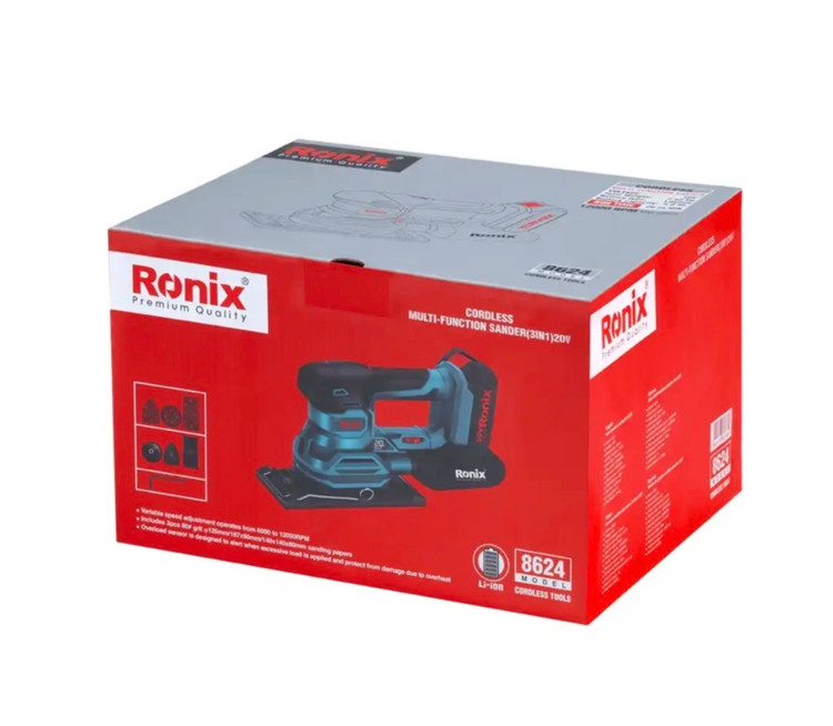 سنباده لرزان شارژی 20 ولت رونیکس مدل 8624 با طراحی سهکاره، ابزاری ایدهآل برای سنبادهکاری میز، دیوار و حتی سقف است. این سنباده شارژی با موتور قدرتمند و پربازده خود، قابلیت تنظیم لرزش بین بازه 6000 الی 12000 لرزش بر دقیقه را ارائه میدهد. همچنین، سیستم تعویض آسان سنباده و مکانیزم اتوماتیک جمعآوری گرد و غبار باعث استفاده راحت از این ابزار شده است.