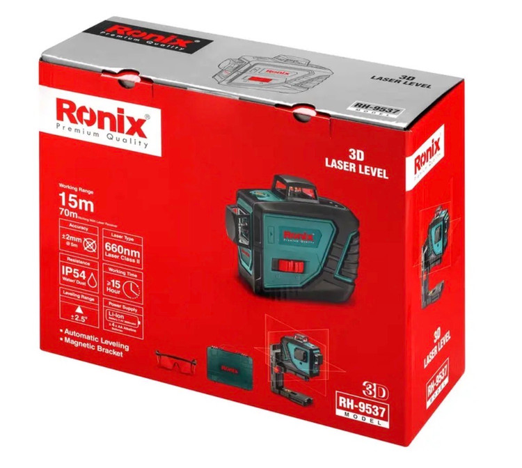 تراز لیزری سه بعدی 360 درجه رونیکس مدل RH-9537 علاوه بر قابلیت خودترازی، دارای قابلیت قفل پاندولی جهت محافظت از سیستم لیزر دستگاه حین حرکت یا جابهجایی و عملکرد تراز به صورت خطوط اریب یا زاویه قائم در جهت دلخواه نیز است.
