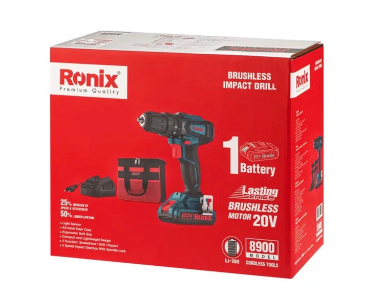 موتور براشلس و مقاوم به رطوبت و غبار در دریل پیچگوشتی 8900 رونیکس، انرژی مورد نیاز خود را از یک عدد باتری لیتیوم یون 20 ولت با طول عمر و دوام بالا تامین میکند. این موتور، 50% طول عمر بیشتر و 25% سرعت و یکنواختی عملکرد بیشتری را از خود نشان میدهد. برای آشنایی بیشتر با مشخصات فنی دریل پیچگوشتی چکشی شارژی 13 میلیمتری براشلس 20 ولت رونیکس با مدل 8900، بخش جزئیات محصول راهنمای خوبی برای شما است.