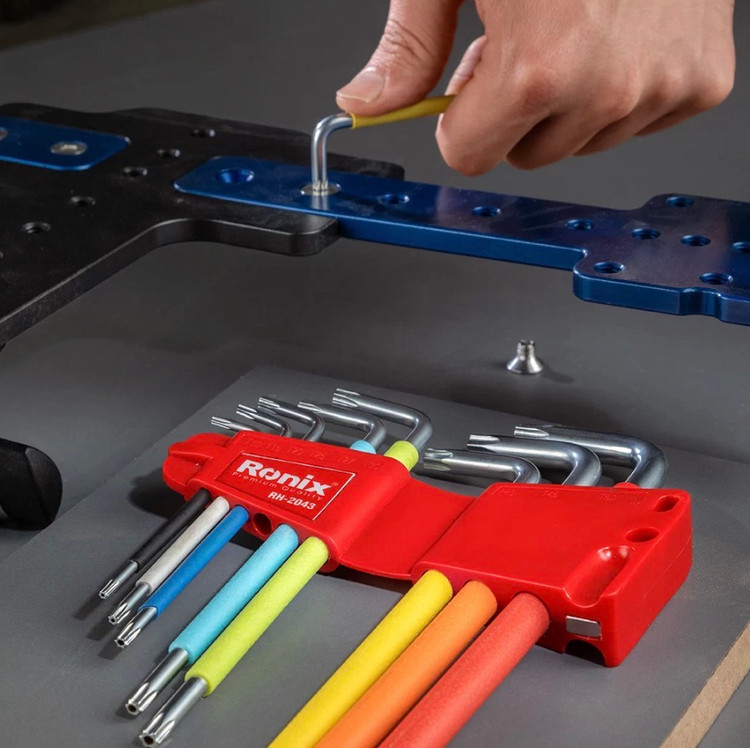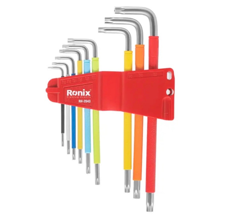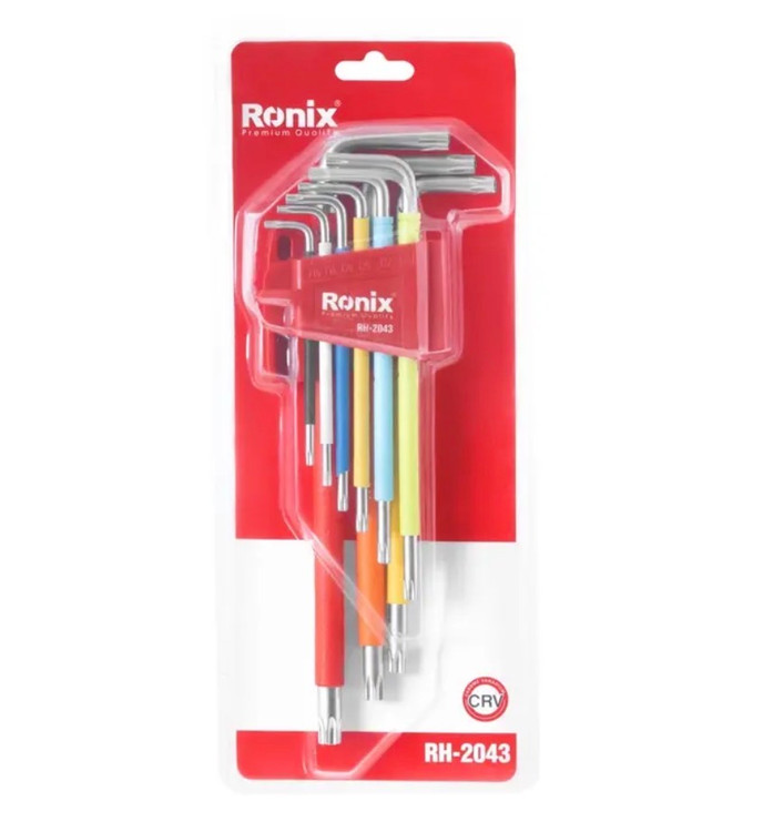 آلن ست 9 عددی ستارهای الوان بلند رونیکس مدل RH-2043، مجموعهای از 8 عدد آچار آلن همراه با یک دسته راحت است. طراحی دقیق و نوک صاف این مجموعه آچار، موجب حداکثر گیرایی و تماس با پیچ میشود.