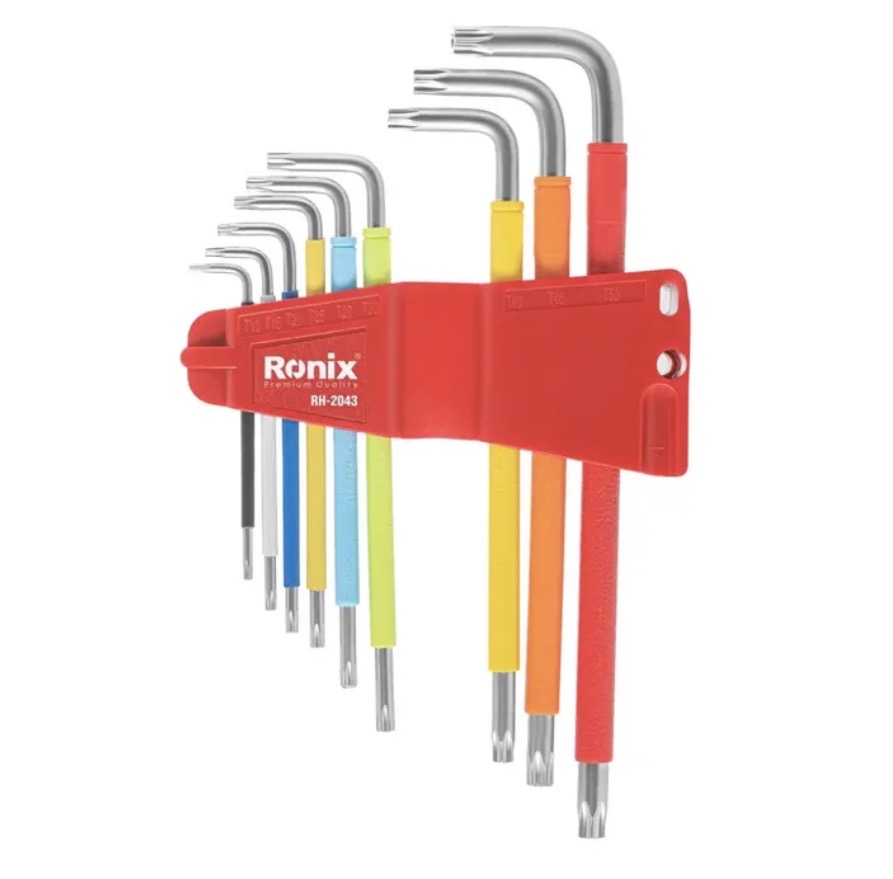 آلن ست 9 عددی ستارهای الوان بلند رونیکس مدل RH-2043، مجموعهای از 8 عدد آچار آلن همراه با یک دسته راحت است. طراحی دقیق و نوک صاف این مجموعه آچار، موجب حداکثر گیرایی و تماس با پیچ میشود.