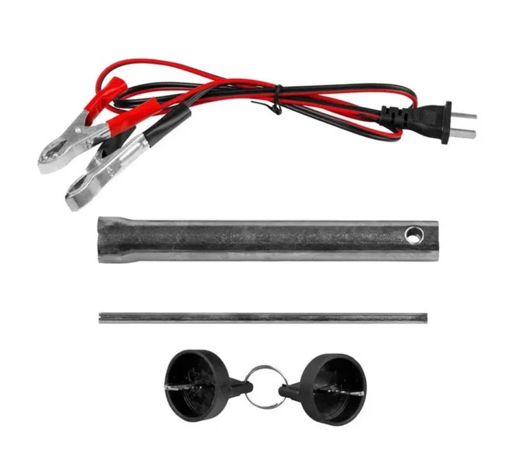 اقلام همراه: دو عدد دوشاخه برق، یک عدد آچار شمع، یک عدد میله، یک جفت سیم خروجی DC ، دو عدد کلید، یک ست چرخ و دستگیره