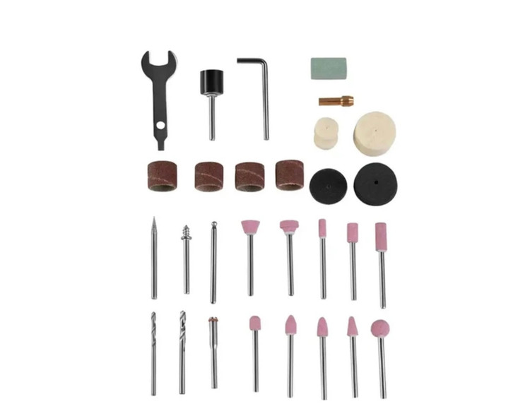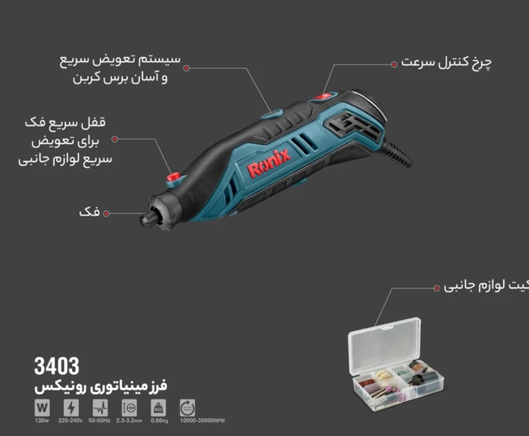 موتور قدرتمند 130 واتى كه جرخشى بالغ بر 10000 تا 35000 دور در دقيقه را فراهم مى كند. - دستكاهى با كارايى بالا، وزن سبك، مناسب براى انجام انواع مختلف عمليات - سرعت قابل تنظيم براى مطابقت با كاربردها ونيازهاى مختلف - دربردارنده 40 قطعه سرى و متعلقات كاربردى ابزارآلات جرخشى براى انجام فعاليت هاى سنباده زنى، برش، سنكازنى، كنده كارى، تميزكارى، پرداخت و ... - سيستم قفلكن پين براى تغيير آسان سرى و متعلقات كاربردى و افزايش ايمنى كاربر - كولت 3.2 ميليمترى براى مطابقت با سرى ها و متعلقات مختلف - داراى سرها و متعلقات كوناكون به منظور ايجاد انواع برش و شيار برروى جوب |